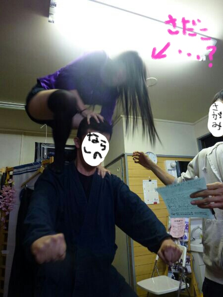 演目(というのか?)に、身体を固めた習志野若に、相模さんが登る!