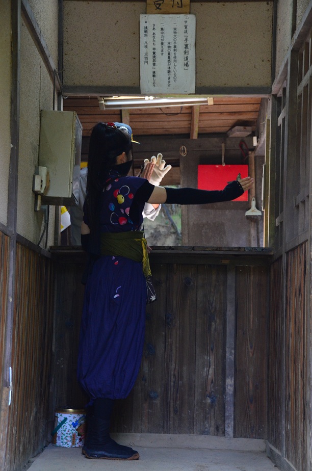 甲賀流の手裏剣の持ち方、打ち方を教わる。